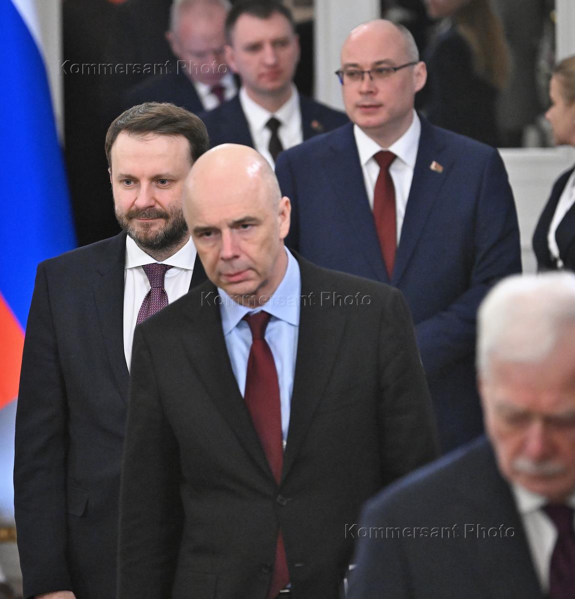 Переговоры президента России Владимира Путина с президентом Белоруссии Александром Лукашенко в Кремле. Заместитель руководителя администрации президента России Максим Орешкин (слева) и министр финансов России Антон Силуанов (в центре) перед началом пресс-конференции по итогам переговоров.