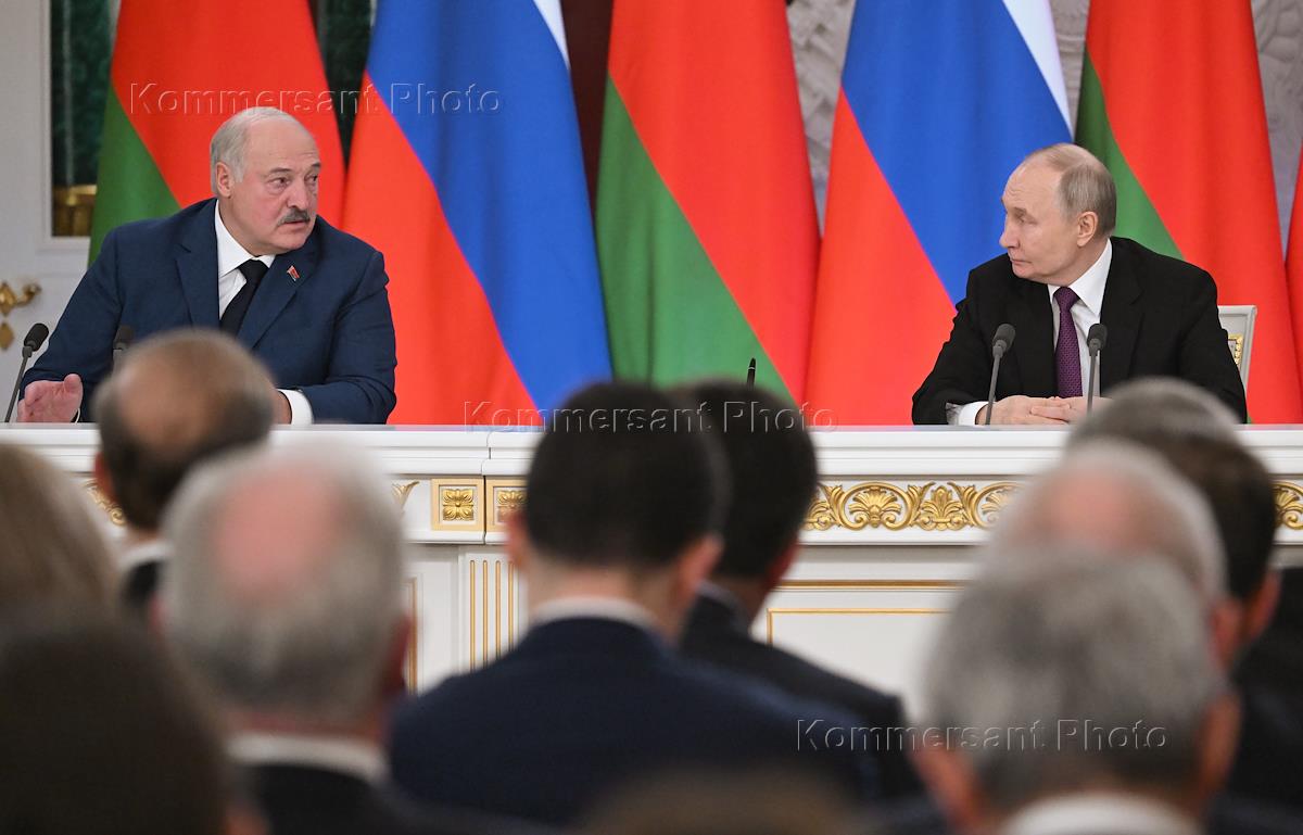Переговоры президента России Владимира Путина с президентом Белоруссии Александром Лукашенко в Кремле. Президент России Владимир Путин (справа) и президент Белоруссии Александр Лукашенко (слева) во время пресс-конференции по итогами переговоров.