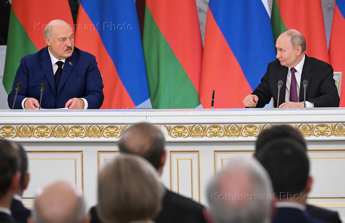 Переговоры президента России Владимира Путина с президентом Белоруссии Александром Лукашенко в Кремле. Президент России Владимир Путин (справа) и президент Белоруссии Александр Лукашенко (слева) во время пресс-конференции по итогами переговоров.