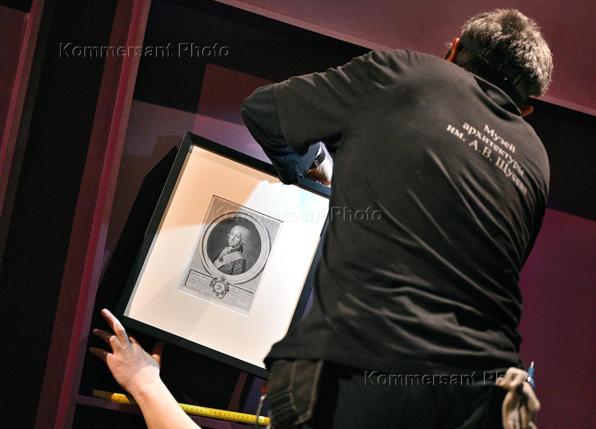 Пресс-показ выставки "1775 год. Триумф Екатерины. Публичное и личное" в Государственном музее архитектуры имени А.В.Щусева. Подготовка выставки.