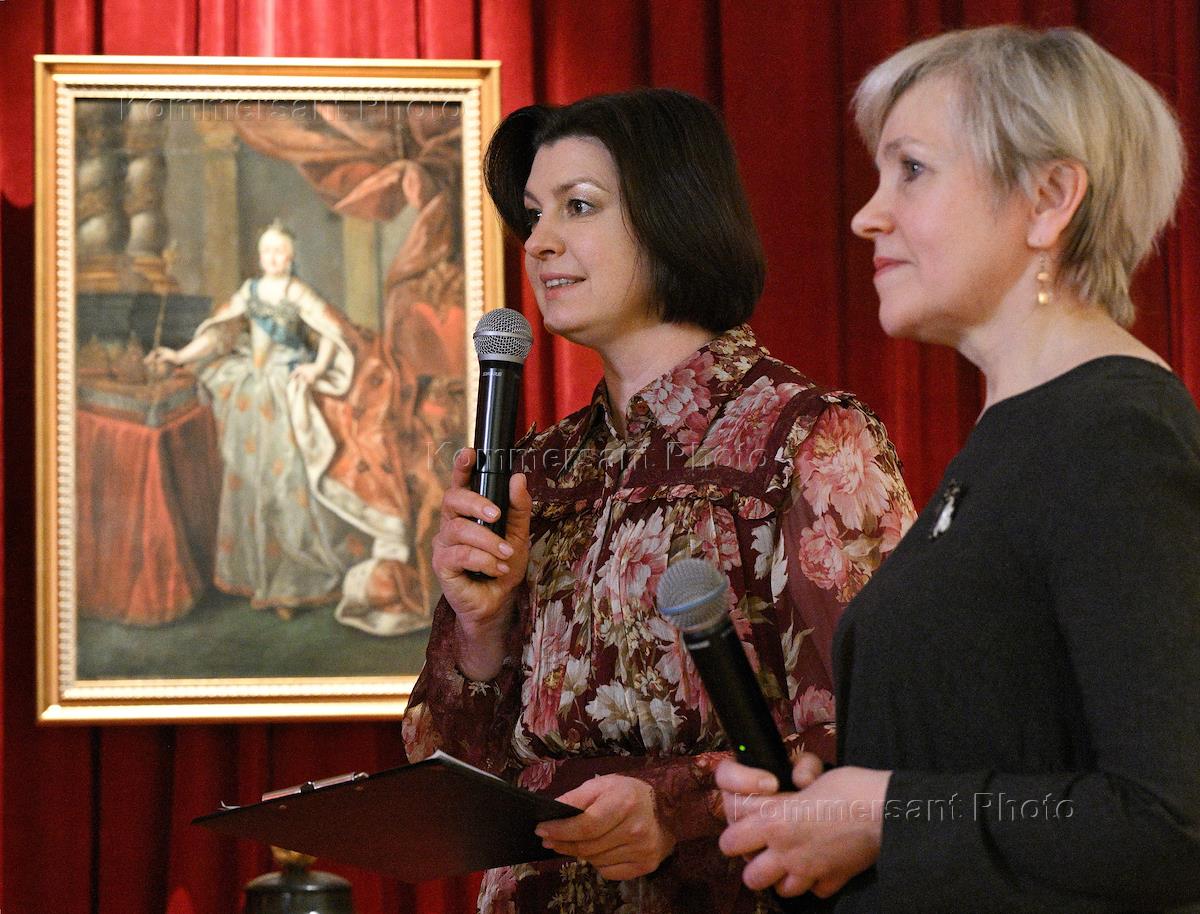 Пресс-показ выставки "1775 год. Триумф Екатерины. Публичное и личное" в Государственном музее архитектуры имени А.В.Щусева. Директор Государственного музея архитектуры имени А.В.Щусева Наталья Шашкова (слева) и куратор выставки, заведующая Отделом хранения архитектурно-графических фондов XVIII-XIX веков Государственного музея архитектуры имени А.В.Щусева Татьяна Дудина (справа) во время пресс-показа.