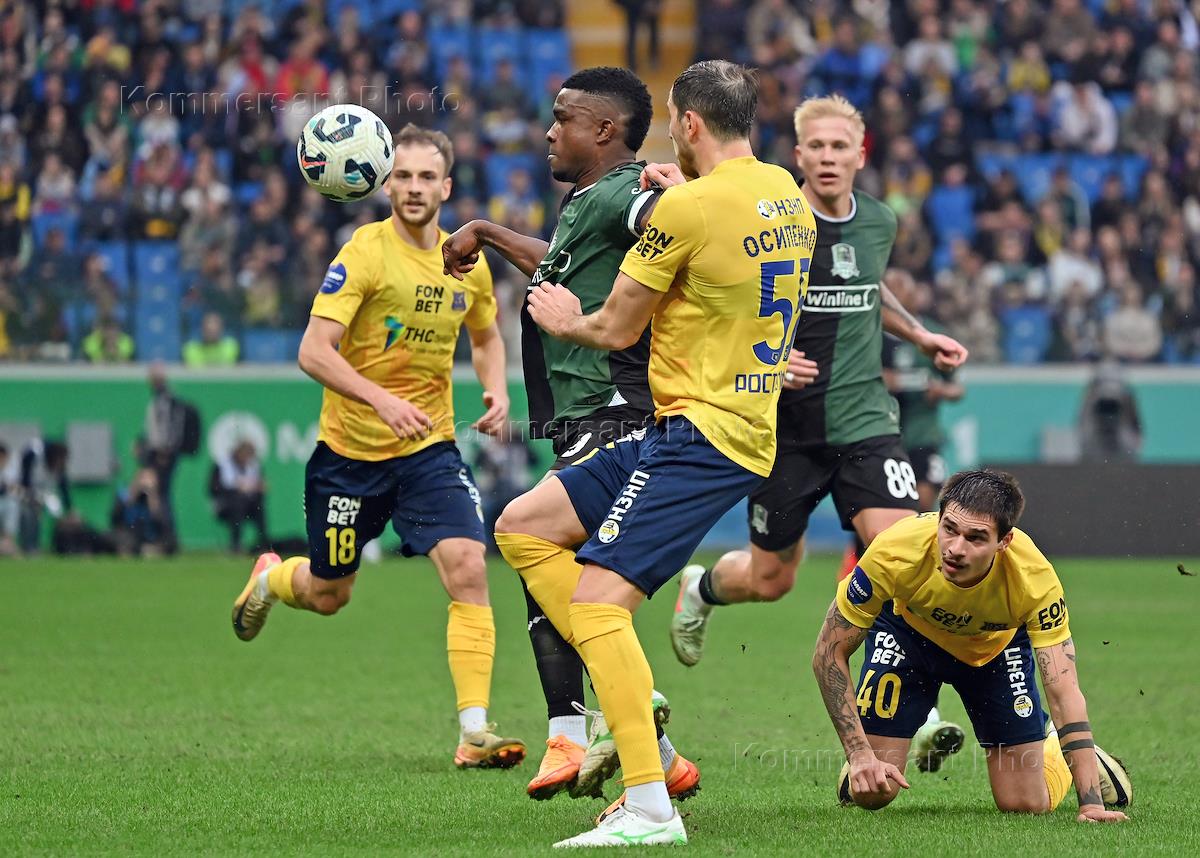 Мир - Российская Премьер-Лига (РПЛ) 2024/2025. 21-й тур. Матч между командами "Ростов" (Ростов-на-Дону) - "Краснодар" (Краснодар) на стадионе "Ростов Арена". Игрок команды "Ростов" Максим Осипенко (в центре) и игрок команды "Краснодар" Джон Кордоба (второй слева) во время матча.