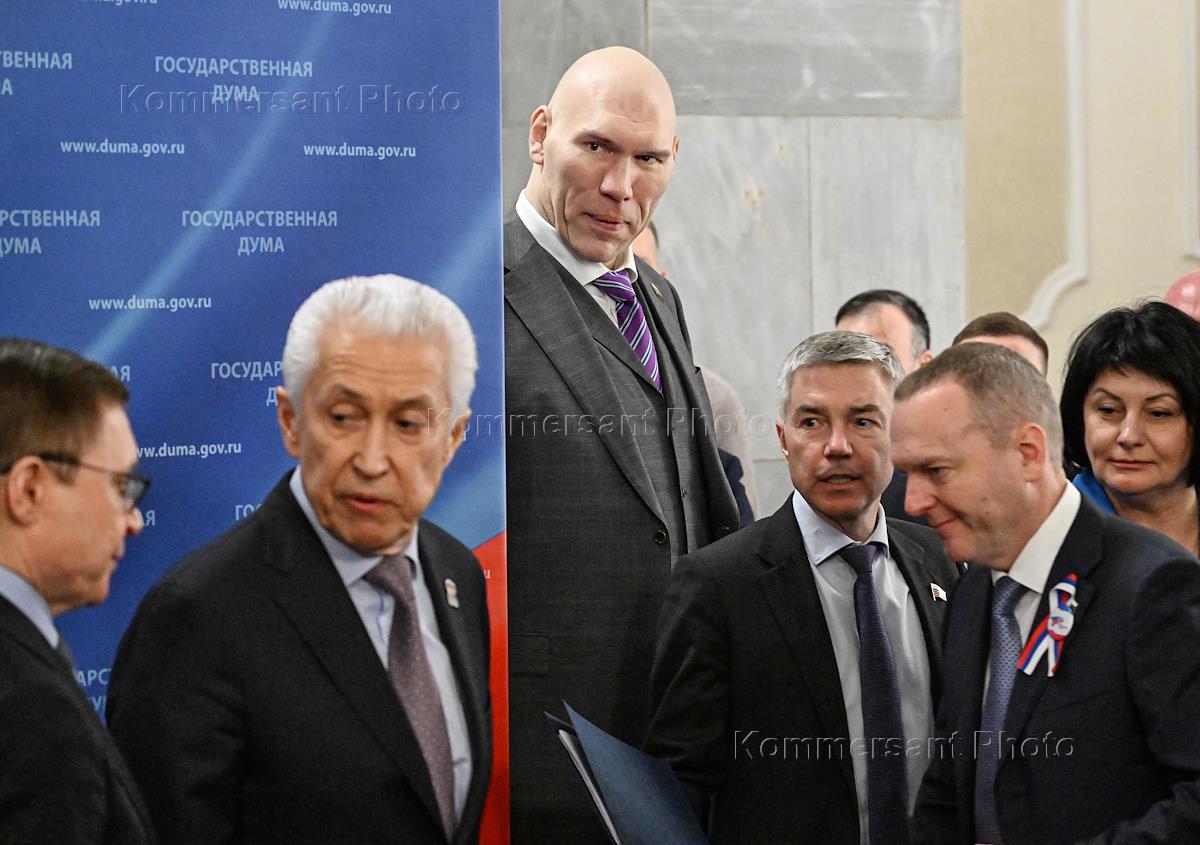 Пленарное заседание Государственной думы (ГД) России. Первый заместитель председателя комитета ГД России по делам Содружества Независимых Государств, евразийской интеграции и связям с соотечественниками Константин Затулин (слева), член комитета ГД России по государственному строительству и законодательству Дмитрий Вяткин (второй слева), первый заместитель председателя комитета ГД России по туризму и развитию туристической инфраструктуры Николай Валуев (в центре) и председатель комитета ГД России по физической культуре и спорту Олег Матыцин (справа) перед началом заседания.