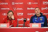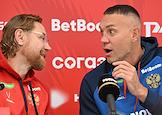 Тренировка сборной России по футболу перед матчем со сборной Гренады и пресс-конференция главного тренера сборной России Валерия Карпина на центральном стадионе "Динамо" имени Льва Яшина. Игрок сборной России Артем Дзюба (справа) и главный тренер сборной России Валерий Карпин (слева) во время пресс-конференции.