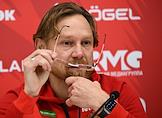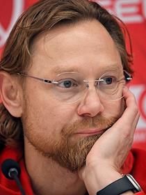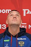 Тренировка сборной России по футболу перед матчем со сборной Гренады и пресс-конференция главного тренера сборной России Валерия Карпина на центральном стадионе "Динамо" имени Льва Яшина. Главный тренер сборной России Валерий Карпин время пресс-конференции.