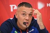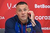 Тренировка сборной России по футболу перед матчем со сборной Гренады и пресс-конференция главного тренера сборной России Валерия Карпина на центральном стадионе "Динамо" имени Льва Яшина. Игрок сборной России Артем Дзюба во время пресс-конференции.