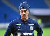 Тренировка сборной России по футболу перед матчем со сборной Гренады на центральном стадионе "Динамо" имени Льва Яшина. Игрок сборной России Антон Миранчук во время тренировки.