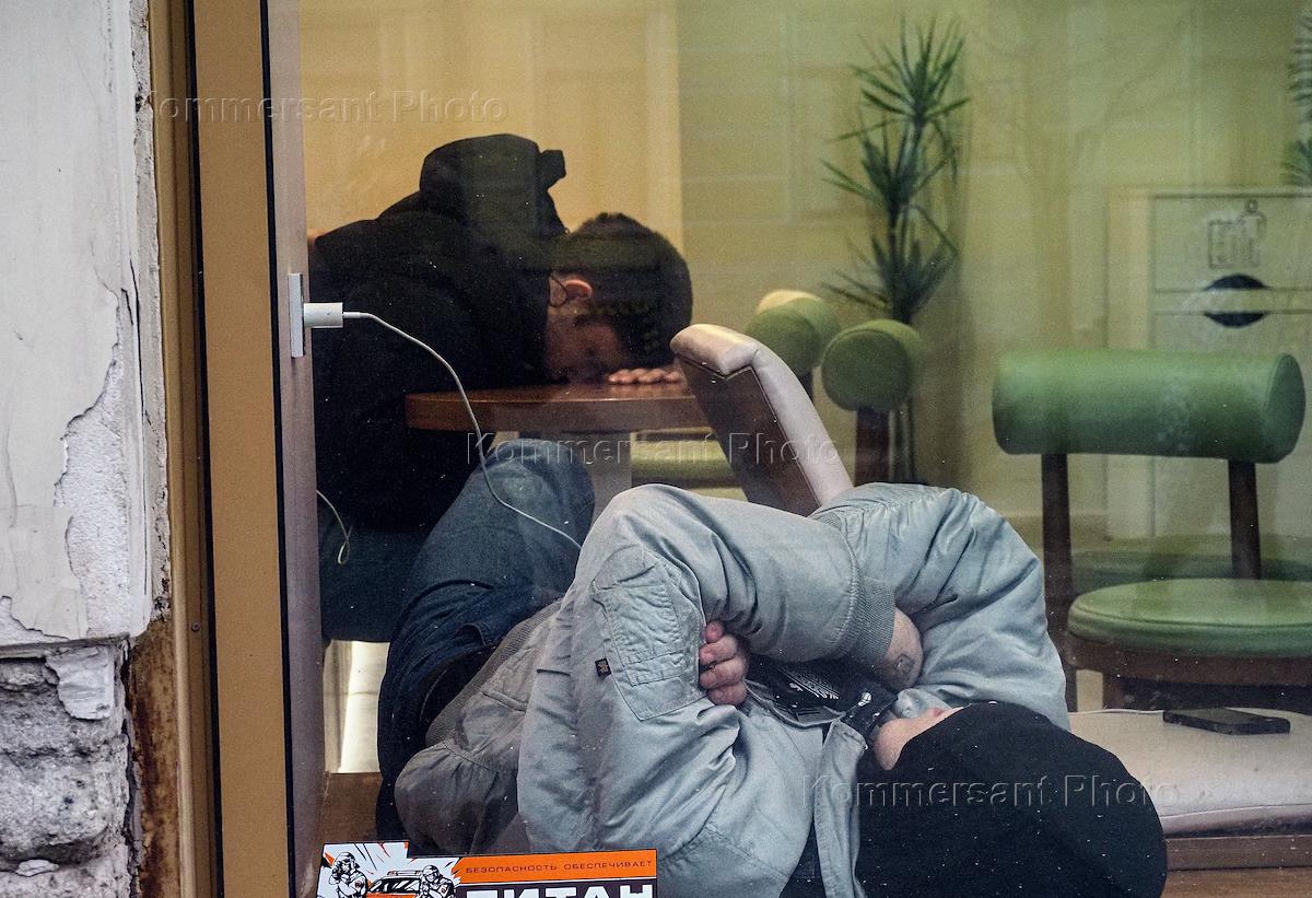 Жанровая фотография. Мужчины спят в холле на стульях.