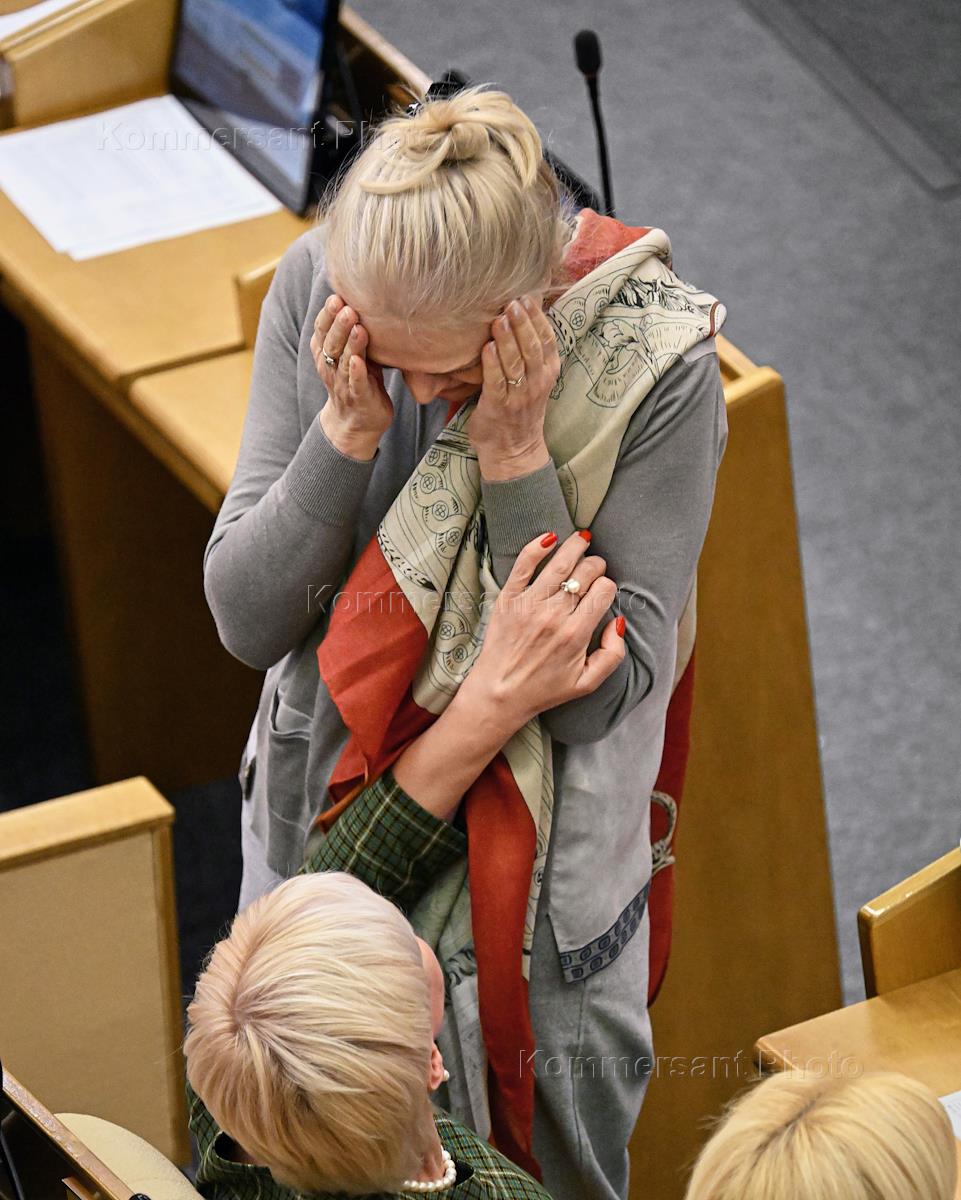 Пленарное заседание Государственной Думы (ГД) России. Член комитета ГД России по международным делам Роза Чемерис (слева) и первый заместитель председателя комитета ГД России по науке и высшему образованию Ксения Горячева (справа) во время заседания.