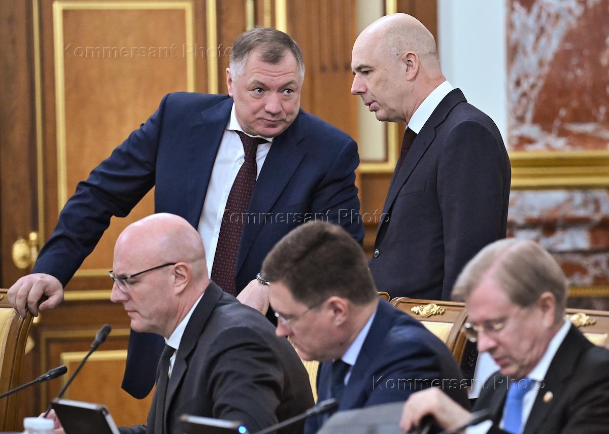 Заседание Правительства России. Заместитель председателя Правительства России Марат Хуснуллин (второй слева) и министр финансов России Антон Силуанов (в центре) перед началом заседания.