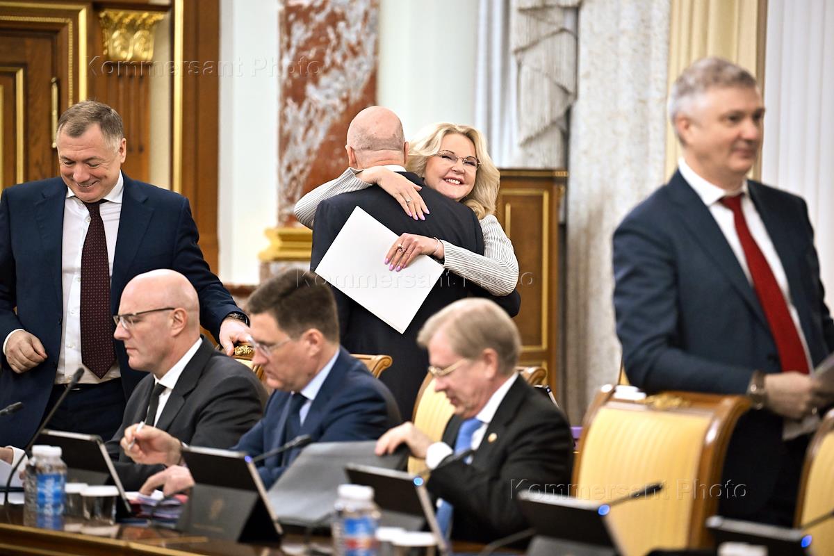Заседание Правительства России. Заместитель председателя правительства России Марат Хуснуллин (слева), министр финансов России Антон Силуанов (в центре) и заместитель председателя правительства России Татьяна Голикова (третья справа) перед началом заседания.