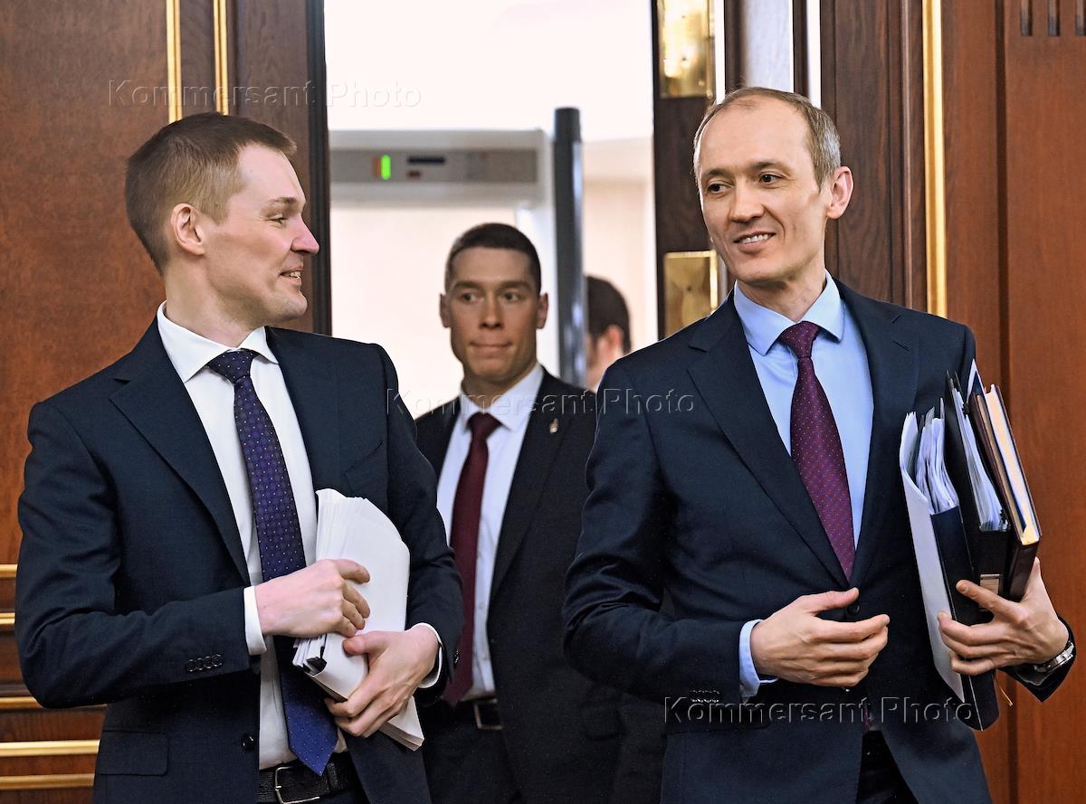 Заседание правительства России. Министр цифрового развития, связи и массовых коммуникаций России Максут Шадаев (слева) и заместитель председателя правительства России Алексей Оверчук (в центре) перед началом заседания.