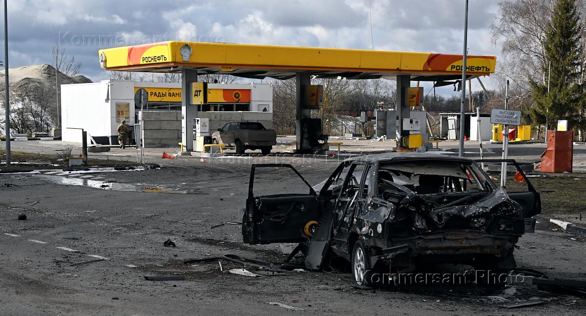 Ситуация в Курской области. Виды Суджи после освобождения от ВСУ. Сгоревший легковой автомобиль на территории автозаправочной станции "Роснефть".