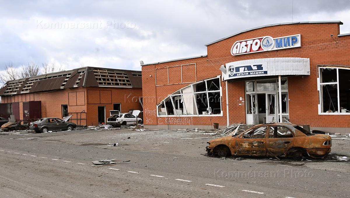 Ситуация в Курской области. Виды Суджи после освобождения от ВСУ. Разбитые здания магазинов и сожженный легковой автомобиль.