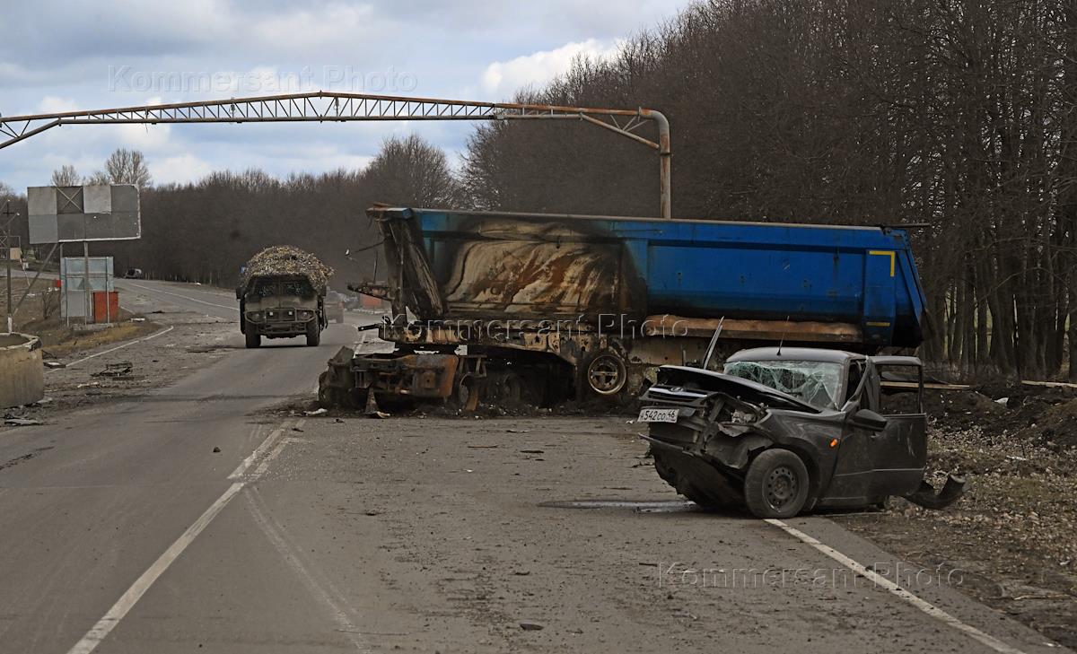 Ситуация в Курской области. Виды Суджи после освобождения от ВСУ. Сгоревшая гражданская техника на дороге города.
