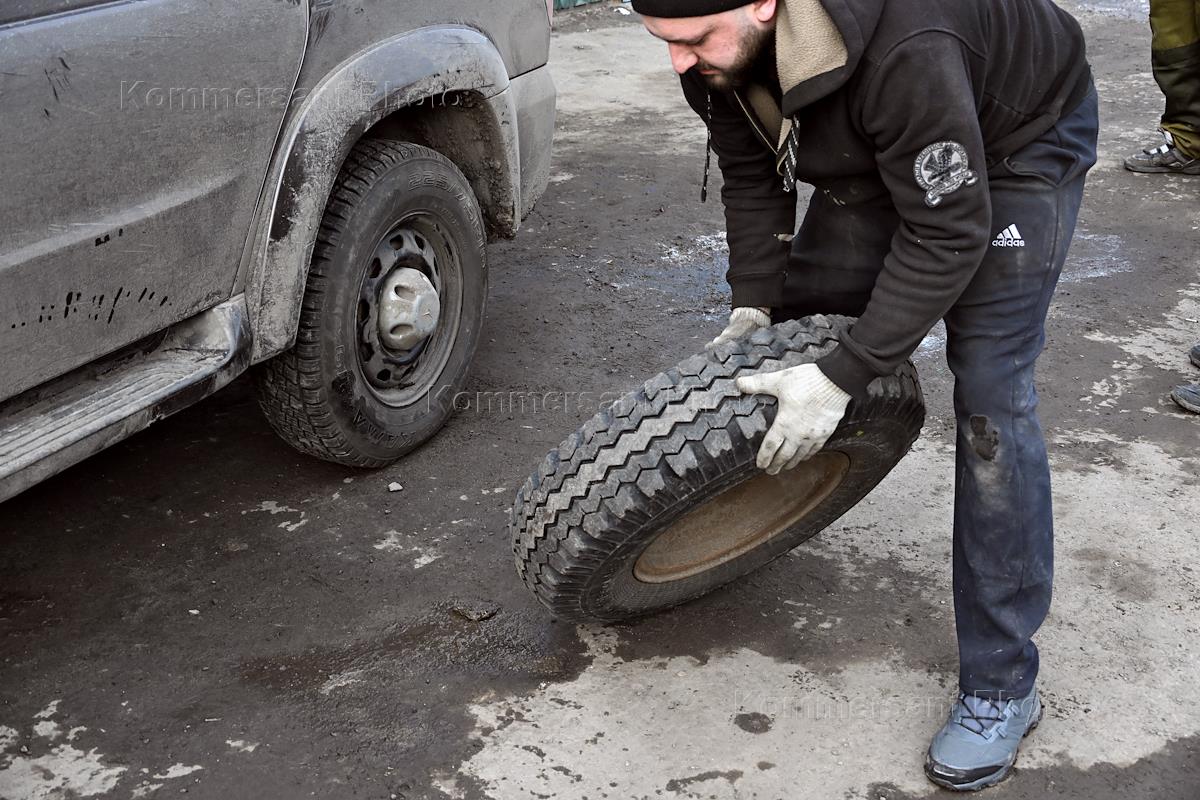 Ситуация в Курской области. Виды Суджи после освобождения от ВСУ. Мужчина меняет колесо на автомобили.