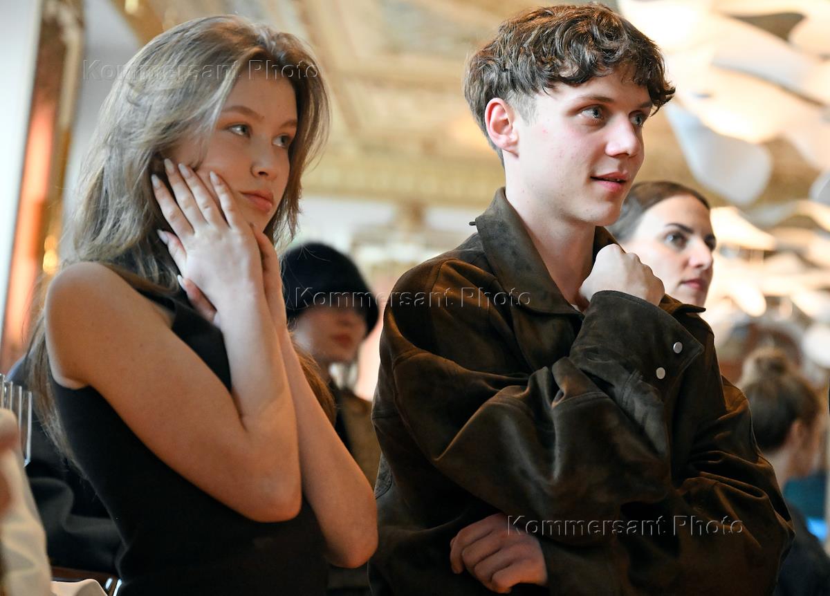 Презентация нового мини-альбома "Венера. Планета легкого поведения" Юлии Пересильд и группы "Мандрагора" в гостинице "Савой". Певец Ваня Дмитриенко (справа) и актриса, дочь актрисы Юлии Пересильд Анна Пересильд (слева) на презентации.