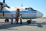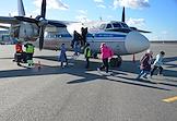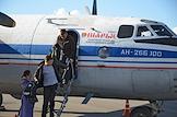 Прибытие первого рейса из Костромы в Международный аэропорт Нижнего Новгорода имени В.П.Чкалова. Пассажиры во время выхода из самолета.