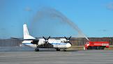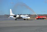 Прибытие первого рейса из Костромы в Международный аэропорт Нижнего Новгорода имени В.П. Чкалова. Прибывший самолет под "водяными воротами" - аркой из гидрантов пожарных машин - во время церемонии встречи.