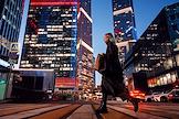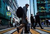 Жанровая фотография. Московский международный деловой центр "Москва-Сити". Пешеходы на переходе центра.