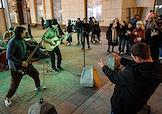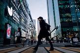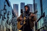 Жанровая фотография. Московский международный деловой центр "Москва-Сити". Пешеходы на переходе центра. Уличный музыкант во время выступления на территории центра.