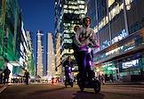 Жанровая фотография. Московский международный деловой центр "Москва-Сити". Молодые люди едут вдвоем на арендном электросамокате.