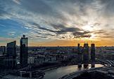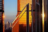Жанровая фотография. Московский международный деловой центр "Москва-Сити". Отражение заката солнца в стеклянных окнах башен центра.