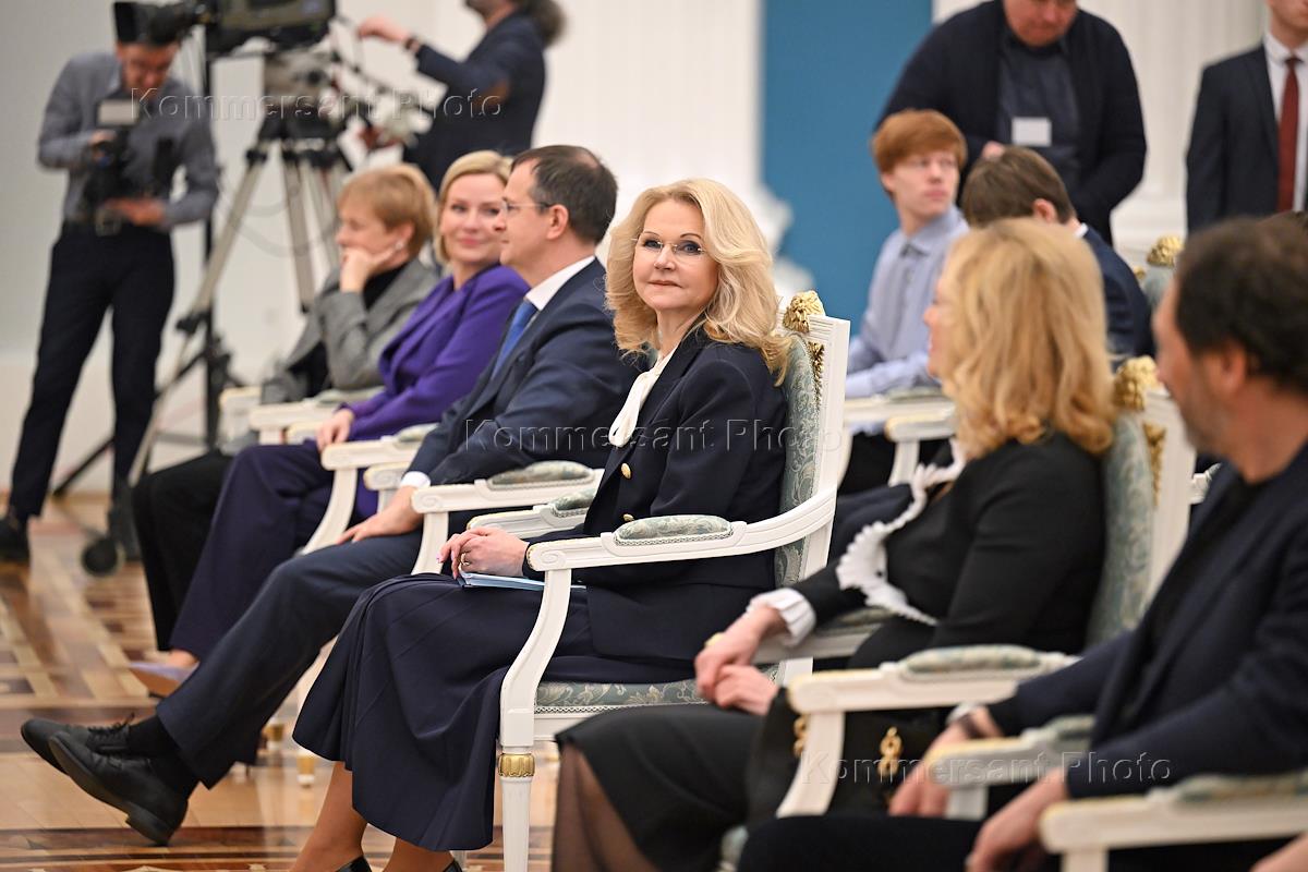 День работника культуры. Церемония вручения премии Президента для молодых деятелей культуры и премии Президента в области литературы и искусства за произведения для детей и юношества за 2024 год в Екатерининском зале Сенатского дворца Кремля. Заместитель председателя правительства России Татьяна Голикова (в центре) перед началом церемонии.