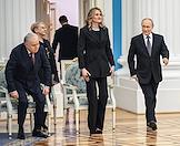 День работника культуры. Церемония вручения премии Президента для молодых деятелей культуры и премии Президента в области литературы и искусства за произведения для детей и юношества за 2024 год в Екатерининском зале Сенатского дворца Кремля. Справа налево: президент России Владимир Путин, главный хормейстер Ансамбля песни и пляски имени В.Локтева Анна Аверьяненко, главный балетмейстер Ансамбля песни и пляски имени В.Локтева Марина Егорова и художественный руководитель Ансамбля песни и пляски имени В.Локтева Леонид Фрадкин во время церемонии.