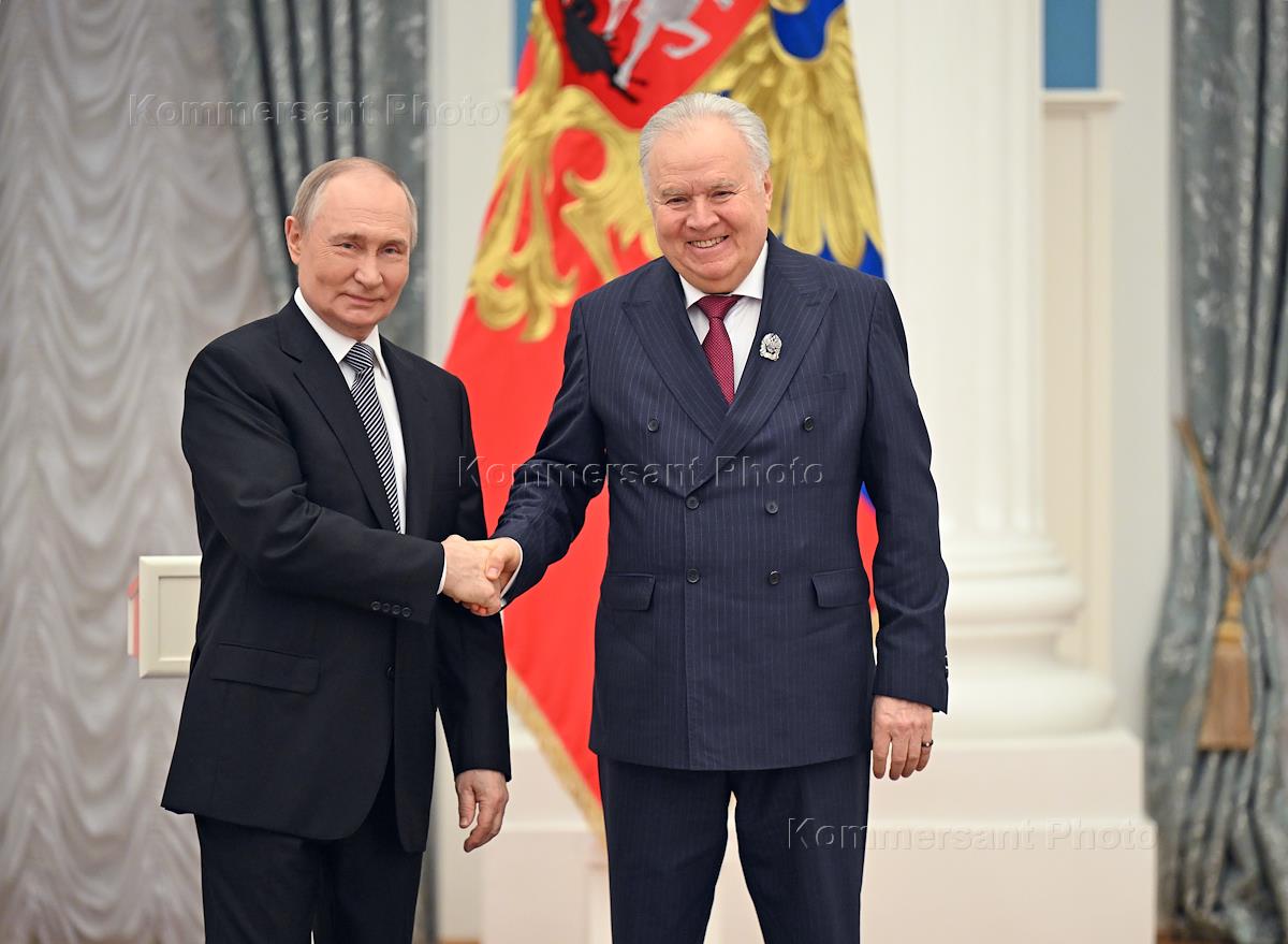 День работника культуры. Церемония вручения премии Президента для молодых деятелей культуры и премии Президента в области литературы и искусства за произведения для детей и юношества за 2024 год в Екатерининском зале Сенатского дворца Кремля. Президент России Владимир Путин (слева) и художественный руководитель Ансамбля песни и пляски имени В.Локтева Леонид Фрадкин (справа) во время церемонии.