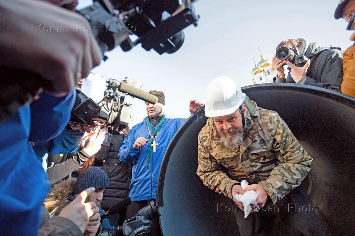 Церемония открытия выставки "За гранью возможного. Операция "Поток", посвященной воинской операции Вооруженных сил России по освобождению Суджи в Курской области, у Храма-памятника на крови во имя Всех Святых в земле Российской просиявших. Участник операции "Поток" иерей Алексей Скрипкин (справа) во время церемонии.