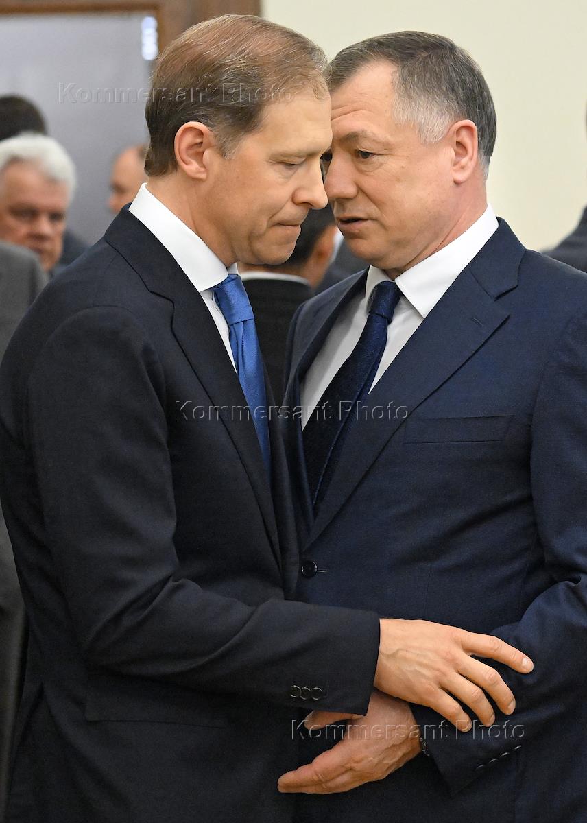 Пленарное заседание Государственной Думы (ГД) России. Отчет председателя правительства России Михаила Мишустина о работе правительства России за 2024 год. Первый заместитель председателя Правительства России Денис Мантуров (слева) и заместитель председателя Правительства России Марат Хуснуллин (в центре) перед началом заседания.