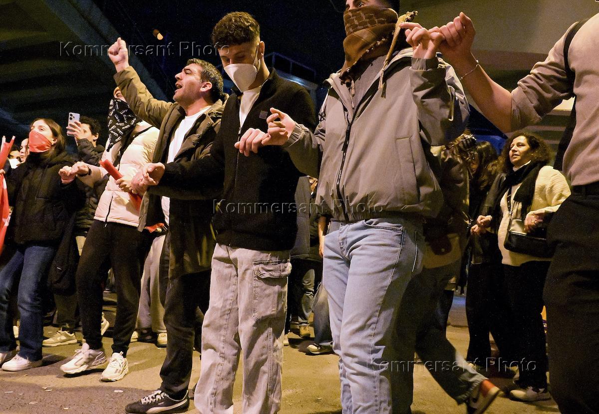 Митинг в поддержку мэра Стамбула Экрема Имамоглу на станции Аксарай в Стамбуле. Жанровая фотография. Люди с плакатами танцуют турецкий танец под звуки барабана.