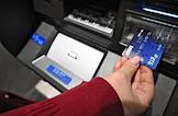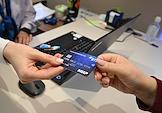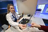 Жанровая фотография. Сотрудница офиса банка ВТБ протягивает пластиковую карту клиенту банка.