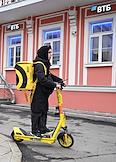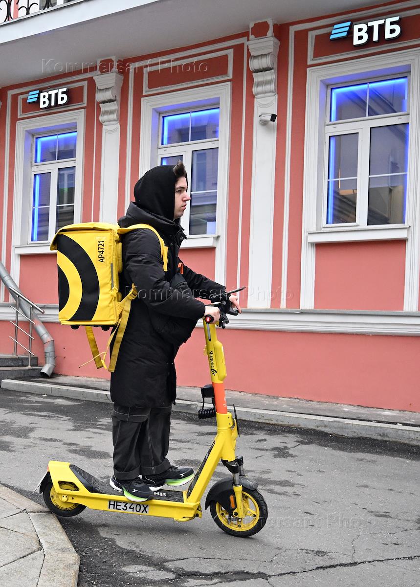 Жанровая фотография. Курьер доставки еды компании "Яндекс GO" на электросамокате у офиса ВТБ.