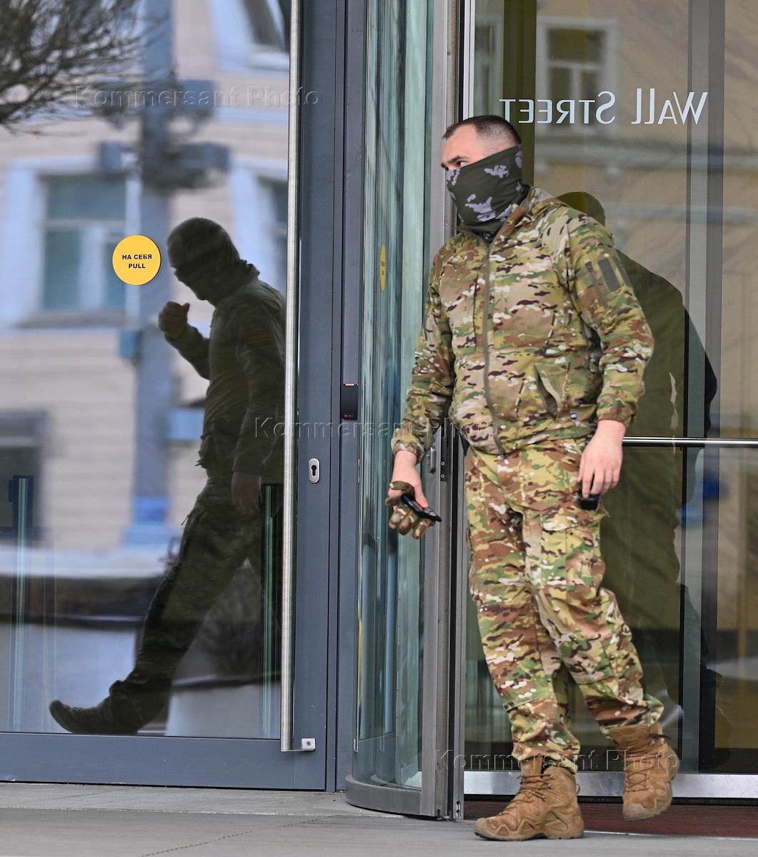 Ситуация у здания бизнес-центра Wall street, где проходят обыски в офисе "Группы Компаний "Русагро". Сотрудник ФСБ России у входа в здание бизнес-центра.