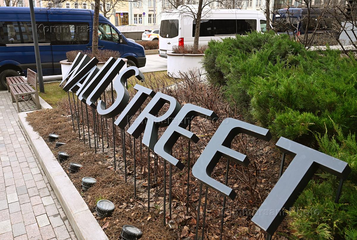 Ситуация у здания бизнес-центра Wall street, где проходят обыски в офисе "Группы Компаний "Русагро". Вывеска бизнес-центра на газоне.