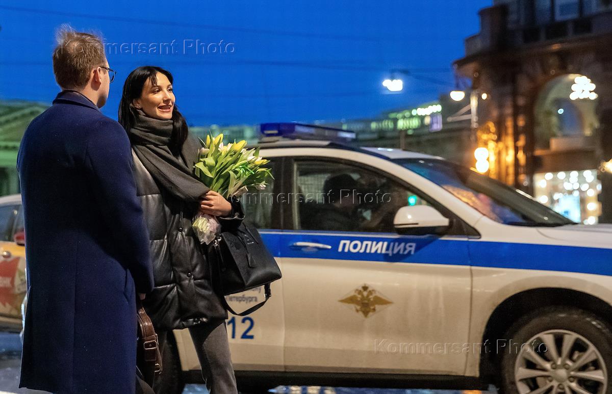 Виды Санкт-Петербурга. Набережная канала Грибоедова. Жанровая фотография. Девушка с цветами на фоне полицейского автомобиля.