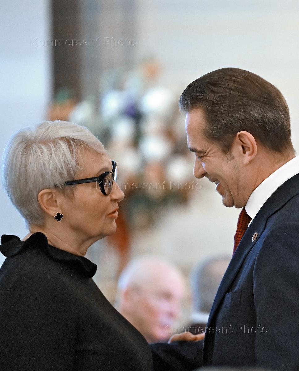 Церемония вручения Специальных премий "Золотая Маска" "За выдающийся вклад в развитие театрального искусства" и "За поддержку театрального искусства России" по итогам сезона 2023-2024 в Бетховенском зале Государственного академического Большого театра (ГАБТ). Председатель Союза кинематографистов России, кинорежиссер Никита Михалков (слева) и актриса Людмила Максакова (в центре) на церемонии.