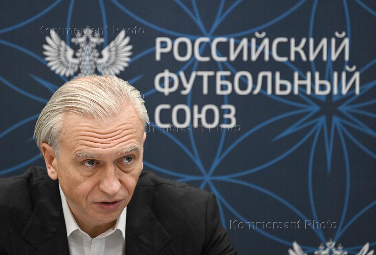 Очередное заседание исполнительного комитета Российского футбольного Союза (РФС) в Доме футбола. Президент РФС, председатель правления, генеральный директор ПАО "Газпром нефть" Александр Дюков (в центре) и генеральный секретарь РФС Максим Митрофанов (слева) во время заседания.