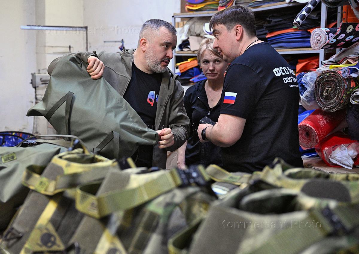 Производство бронежилетов для служебных собак, участвующих в СВО. Жанровая фотография. Слева направо: директор компании Артем Ивлев, начальник производства Ирина Тепцова и исполнительный директор производства Роман Дудко во время демонстрации бронежилета.