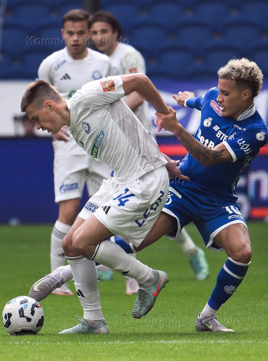 Мир Российская Премьер-Лига (РПЛ) 2024/2025. 22-й тур. Матч между командами "Динамо" (Москва) - "Оренбург" (Оренбург) на стадионе "ВТБ Арена". Игрок команды "Оренбург" Максим Савельев (справа) во время матча.