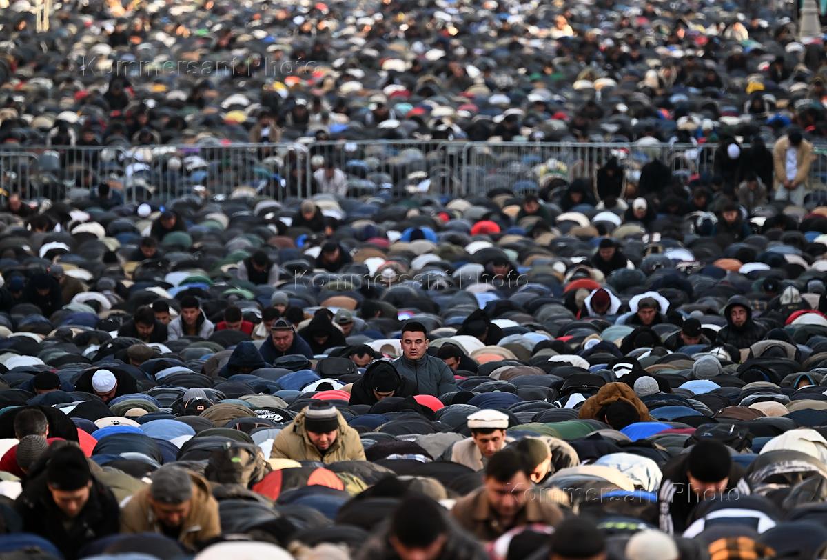 Праздничные мероприятия в день Ураза-Байрам в Московской Соборной мечети. Верующие во время богослужения.