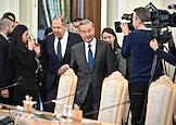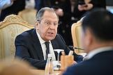Министр иностранных дел России Сергей Лавров (в центре, слева) и министр иностранных дел Китайской Народной Республики Ван И (в центре, справа) перед началом переговоров в Доме приёмов МИД России.