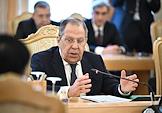 Министр иностранных дел России Сергей Лавров во время переговоров с министром иностранных дел Китайской Народной Республики Ван И в Доме приёмов МИД России.