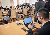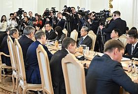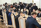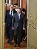 Переговоры Министра иностранных дел России Сергея Лаврова с членом Политбюро, руководителем Канцелярии Комиссии ЦК КПК по иностранным делам, Министром иностранных дел Китайской Народной Республики Ван И в Доме приемов МИД России. Жанровая фотография. Участники переговоров.