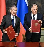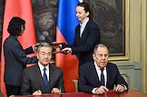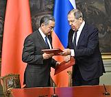 Министр иностранных дел России Сергей Лавров (справа) и министр иностранных дел Китайской Народной Республики Ван И (слева) во время церемонии подписания документов по итогам переговоров в Доме приемов МИД России.