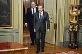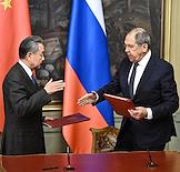 Министр иностранных дел России Сергей Лавров (слева) и министр иностранных дел Китайской Народной Республики Ван И (в центре) перед началом подписания документов по итогам переговоров в Доме приемов МИД России.