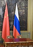 Переговоры Министра иностранных дел России Сергея Лаврова с членом Политбюро, руководителем Канцелярии Комиссии ЦК КПК по иностранным делам, Министром иностранных дел Китайской Народной Республики Ван И в Доме приемов МИД России. Жанровая фотография. Государственные Флаги России и Китая в зале переговоров.