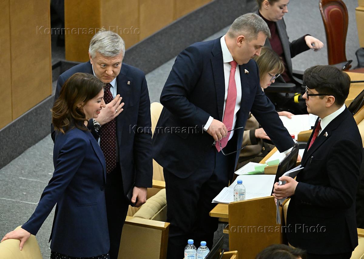 Пленарное заседание Государственной Думы (ГД) России. Справа налево: заместитель председателя комитета ГД России по развитию гражданского общества, вопросам общественных и религиозных объединений Владимир Шаманов, член комитета ГД России по делам Содружества Независимых Государств, евразийской интеграции и связям с соотечественниками Артем Кавинов, член комитета ГД России по аграрным вопросам Дмитрий Лоцманов, член комитета ГД России по энергетике Наталья Назарова и заместитель председателя комитета ГД России по вопросам собственности, земельным и имущественным отношениям Николай Николаев (слева) во время заседания.